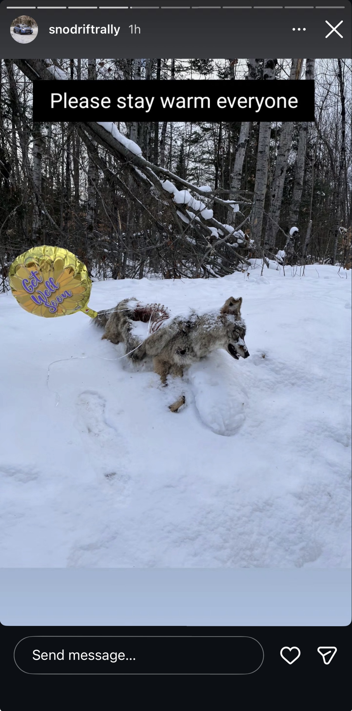 We bounced out of the parc expose kinda early, but still ended up being late to the first stage. SnoDrift was incredibly efficient with their timing. They were on it compared to LSPR which ran late frequently for a number of reasons. We parked far away because other spectators had some skill issue or whatever. We walked geared up in warm clothes with a heater, food, chairs, and noisemakers, and we walked about two miles. Walking on snow also. I was so wiped out by the end of it. The stages were ran twice in SnoDrift, so we missed the first one, but that was okay because they'd race it again. We found a nice mound to stand on top of and be annoying. Everyone was fucking annoying honestly. Everyone had fires which was nice and warm, but everyone was also blasting music and were piss drunk. Being drunk is fun and all and like you're gonna be standing around for hours, so might as well, but idk maaaan I'm here for the cars not the shitty tractor rap blasting out of your speakers on wheels. Of course, I'm too shy to say anything. We were annoying in our own way. Equipped with a weird airhorn from Ax-Man, a cowbell, and a vuvuzela, we ruined everyone's videos of the cars including mine, so I can't make a sick edit of the race cause it's ALL vuvuzela!! The noise mission was completed, and it was funny. It was also too cold to record anything. I enjoyed most of this stage with just my eyes.